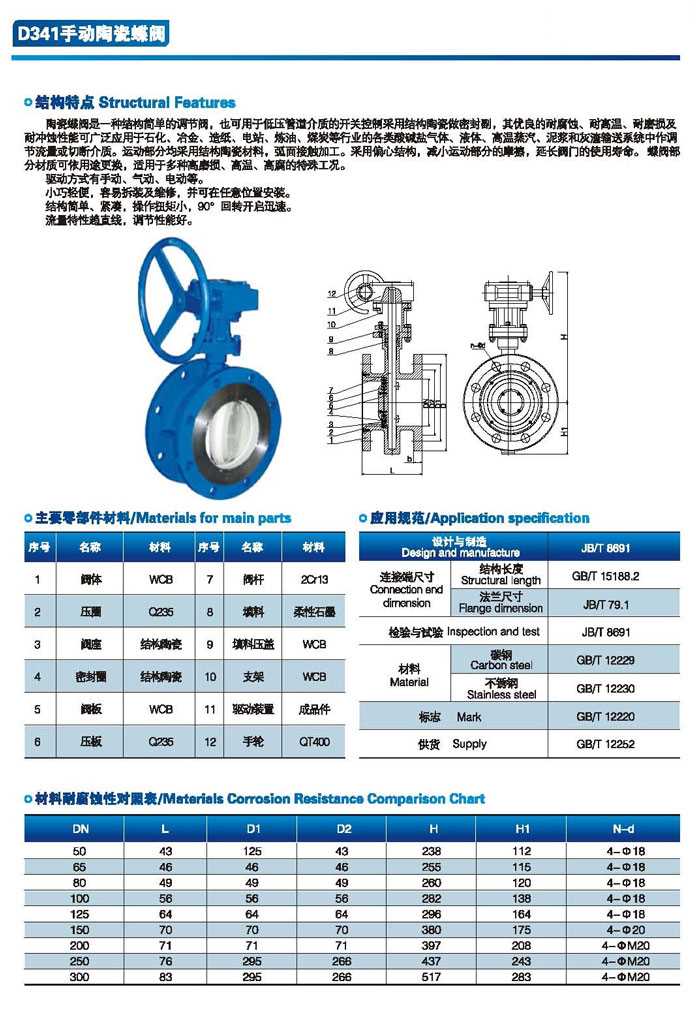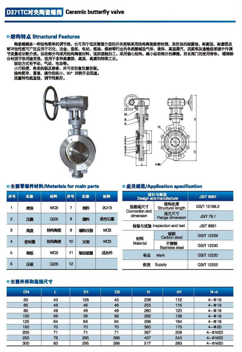 產(chǎn)品規(guī)范: 設(shè)計(jì)規(guī)范:JB/T 8527 結(jié)構(gòu)長(zhǎng)度:GB/T 12221 連接標(biāo)準(zhǔn):GB/T 9113 壓力試驗(yàn):JB/T 9092 產(chǎn)品標(biāo)識(shí):GB/T 12220 供貨規(guī)范:GB/T 12252 主要零部件材料: 主體:碳鋼(WCB)、不銹鋼(CF8、CF8M、CF3、CF3M)等 蝶板:不銹鋼 閥桿:不銹鋼 填料:橡膠/聚四氟乙烯/編織石墨 公稱(chēng)通徑:DN50-DN500(2"-20") 公稱(chēng)壓力:PN6-PN25 適用溫度:-29~+425 操作方式:手輪,傘齒輪、氣動(dòng)、電動(dòng)、液動(dòng)、電液(可選) 適用介質(zhì):紙漿、污水、煤漿、礦渣等磨損性介質(zhì) 陶瓷蝶閥,D371TC陶瓷蝶閥參數(shù)尺寸圖: