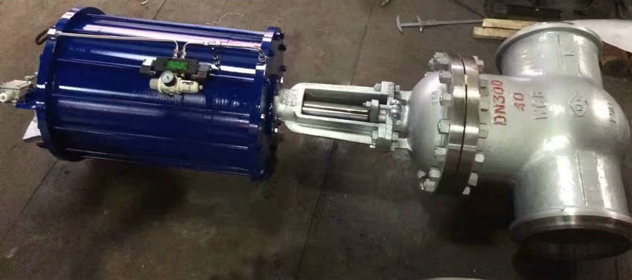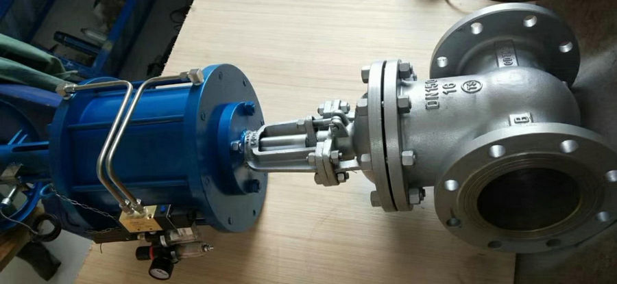 1、閘閥開啟前階段:上層氣缸的活塞(以下簡稱上活塞)和下層氣缸的活塞(以下簡稱下活塞)同時受力,閥桿在上、下活塞的推動下,以單活塞近二倍的提升力,克服閘板密封面和閥體密封面之間的最大靜磨擦力,帶動閘板上升。 壓縮空氣由上氣缸的下氣室,經由設置在隔板的特定通道,通過連通管,到達下氣缸的下氣室,推動上下活塞同時工作。下氣缸上氣室中的氣體,經過設置在隔板內的另一特定通道。暢通無阻的排出氣缸體外。