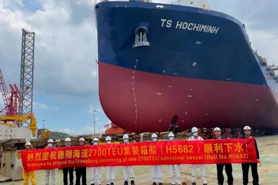 2021年6月18日,中國船舶集團旗下黃埔文沖公司為德翔海運建造的2700TEU集裝箱船2#船H5682在水平船臺順利下水,即將開始碼頭階段的施工作業(yè)。