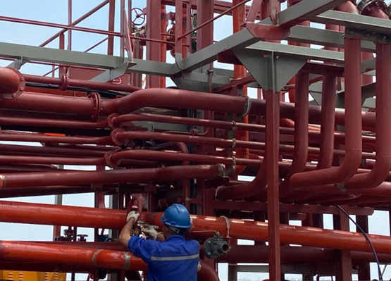 攻關(guān)小組首先采取Framo液壓管單元安裝形式,將12路管支架在內(nèi)場拼裝為組合支架,并同時制作多個單元,再上船安裝,既減少了現(xiàn)場施工的工作量,又大大提高了工作效率。在提升工作效率的同時,攻關(guān)小組嚴把產(chǎn)品質(zhì)量關(guān),嚴格按照工藝要求進行施工,先用臨時支撐固定管件,保證整個管路管件無外力拉扯,再安裝好彈性支撐,確保自然狀態(tài)下無伸縮變形,最后將法蘭連接螺栓緊固到位,以及船用蝶閥符合安裝標準確保后續(xù)密試工作順利進行。