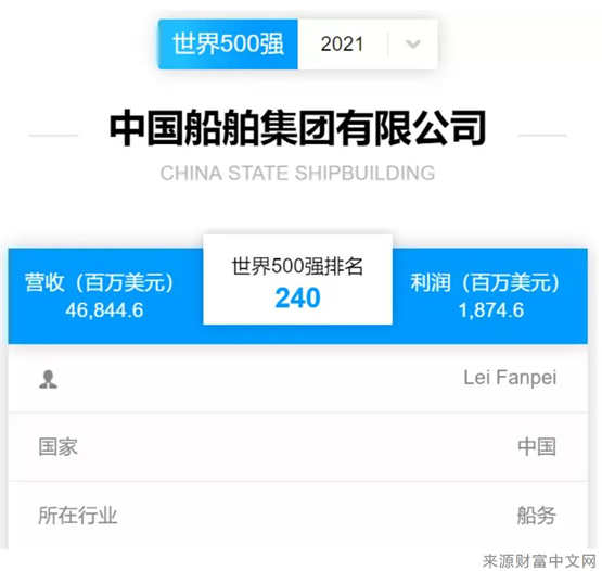 北京時(shí)間2021年8月2日,《財(cái)富》中英文網(wǎng)站同時(shí)發(fā)布2021《財(cái)富》世界500強(qiáng)排行榜,中國(guó)船舶集團(tuán)有限公司以468.446億美元的營(yíng)業(yè)收入位列全球榜單第240位。