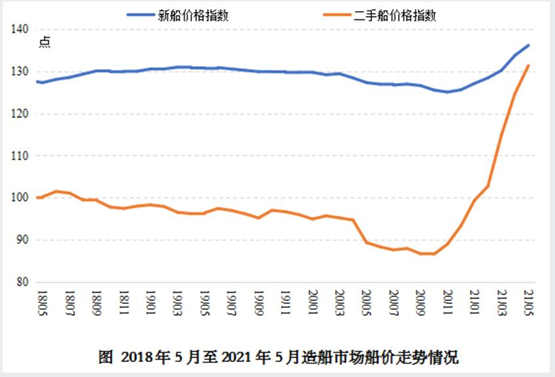 2021年初以來,在航運(yùn)市場(chǎng)上升需求拉動(dòng)與用鋼成本上升推動(dòng)下,全球造船市場(chǎng)新船價(jià)格開始上揚(yáng)。數(shù)據(jù)顯示,截止2021年5月28日,衡量全球造船市場(chǎng)新船價(jià)格總體的克拉克森新船價(jià)格指數(shù)收于136點(diǎn),較年初的126點(diǎn)上漲7.9%。分項(xiàng)指數(shù)來看,克拉克森散貨船、油船和集裝箱船新船價(jià)格指數(shù)分別上漲14.8%、8.0%和16.2%。